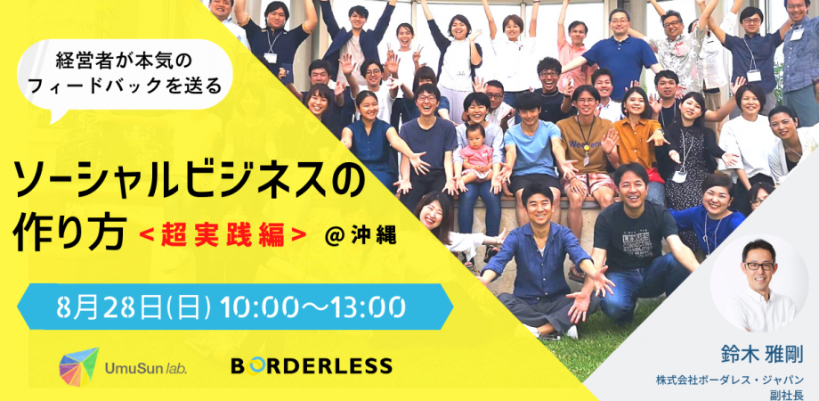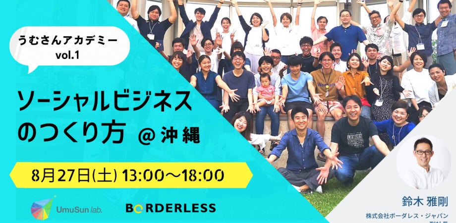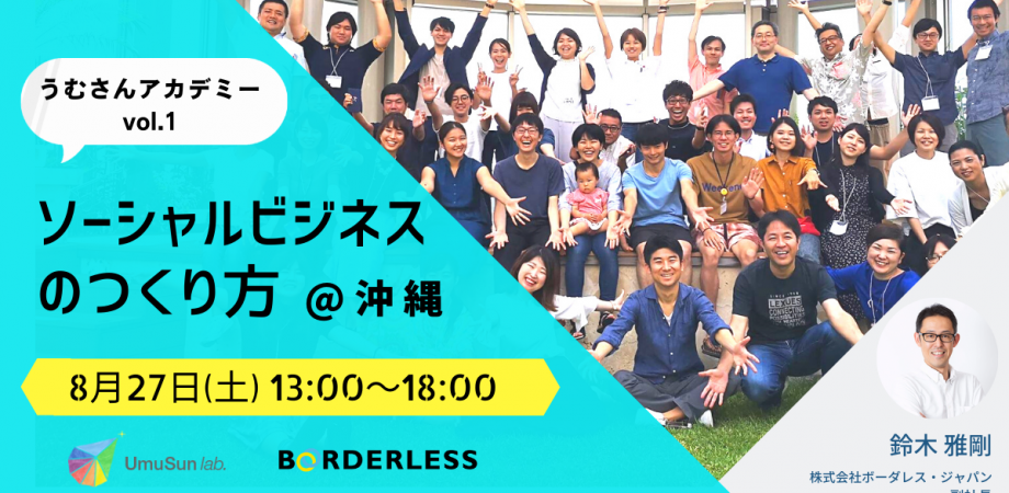 16ヶ国で47のソーシャルビジネスを展開する株式会社ボーダレス・ジャパン(代表取締役 田口一成/東京都新宿区)と、「社会をより豊かにする」事業を支援する株式会社うむさんラボ(代表取締役 比屋根隆/沖縄県うるま市)が、社会課題の解決を目指す学生に向けてソーシャルビジネスのつくり方を実践的に学ぶ「うむさんアカデミー」を開催します。(8月27,28日、那覇市)