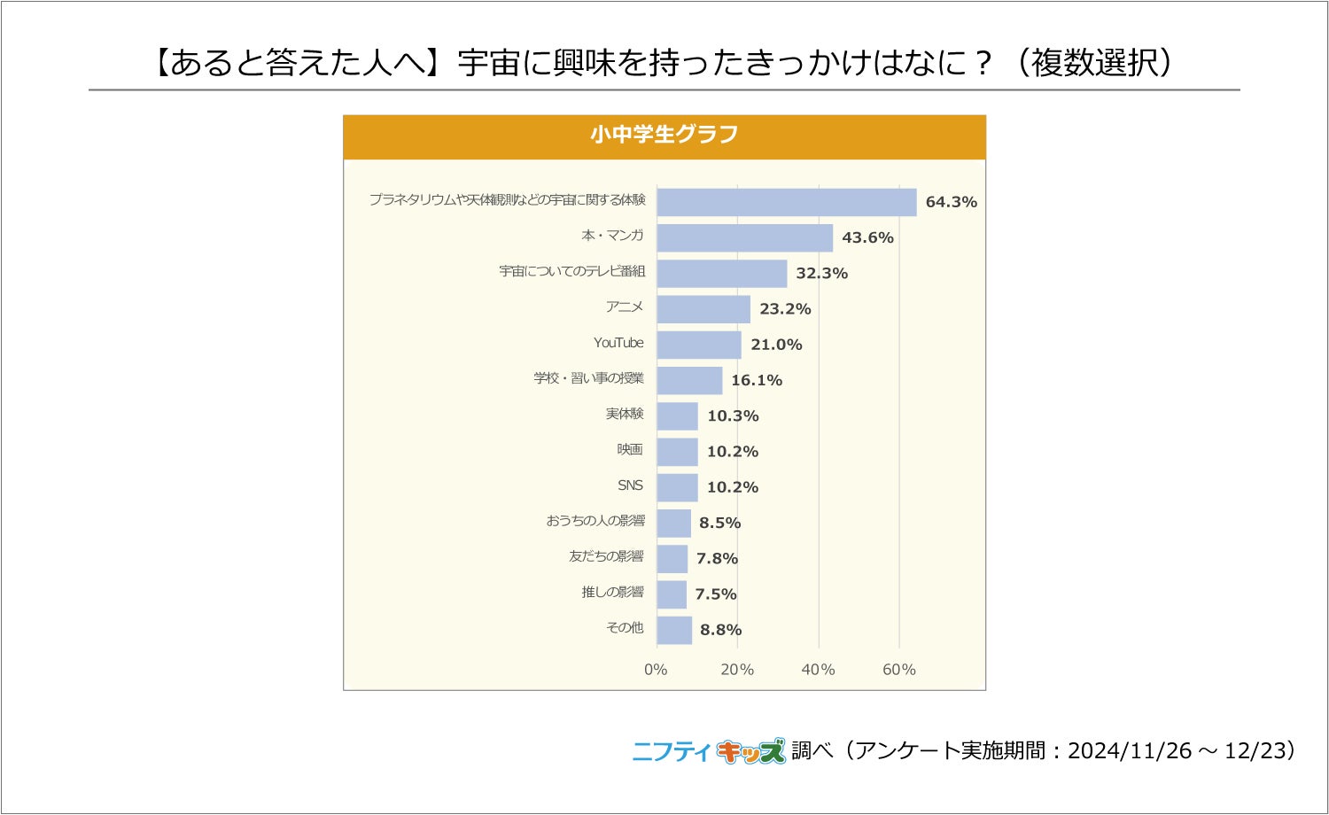 宇宙に興味が「ある」と答えた小中学生は68.4%でした。その中で「プラネタリウムや天体観測などの宇宙に関する体験」をきっかけに宇宙に興味を持った人は64.3%で、「宇宙に関する体験」で最も多い回答は「プラネタリウム」でした。