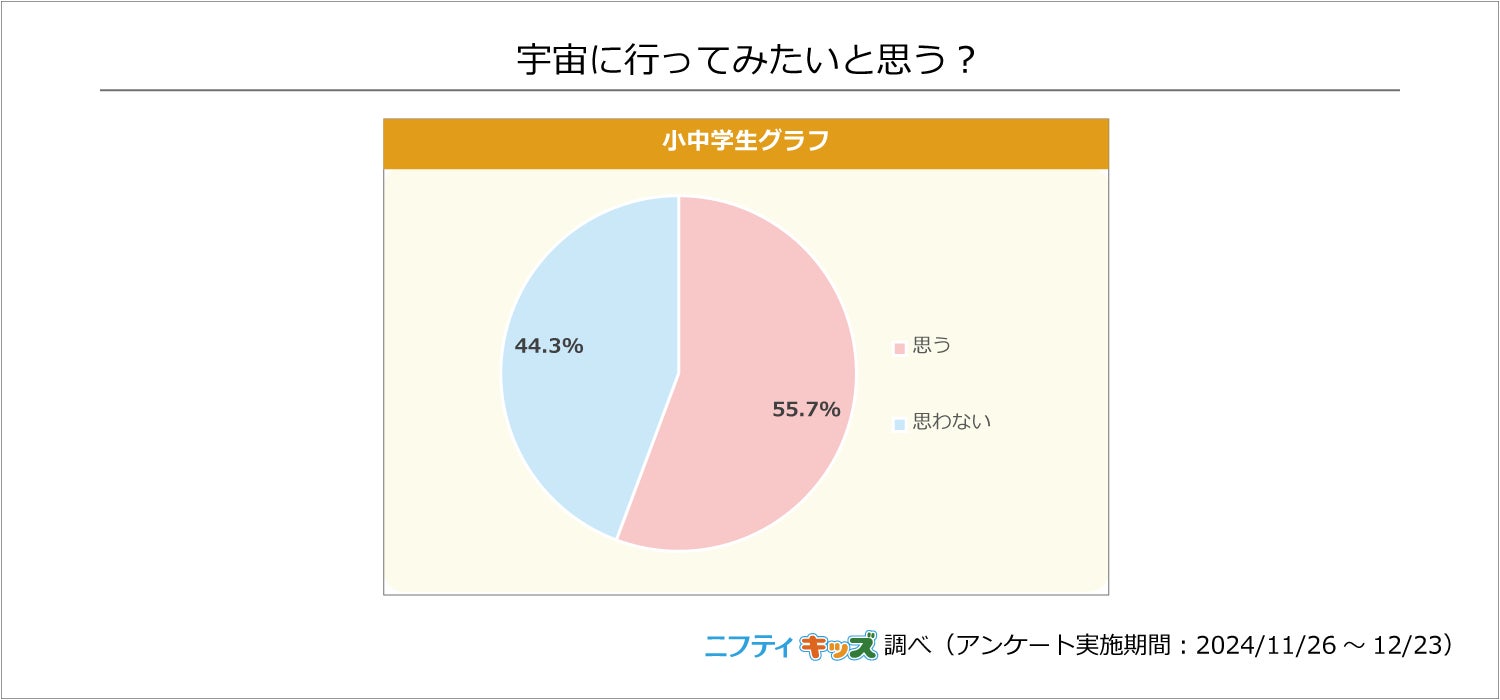 また、宇宙に行ってみたいと思うかを聞いたところ、小中学生の55.7%が「思う」と回答し、「無重力を体験してみたい」「宇宙から地球を見てみたい!!」など、半数以上の子どもたちが宇宙への憧れを持っていることがわかりました。