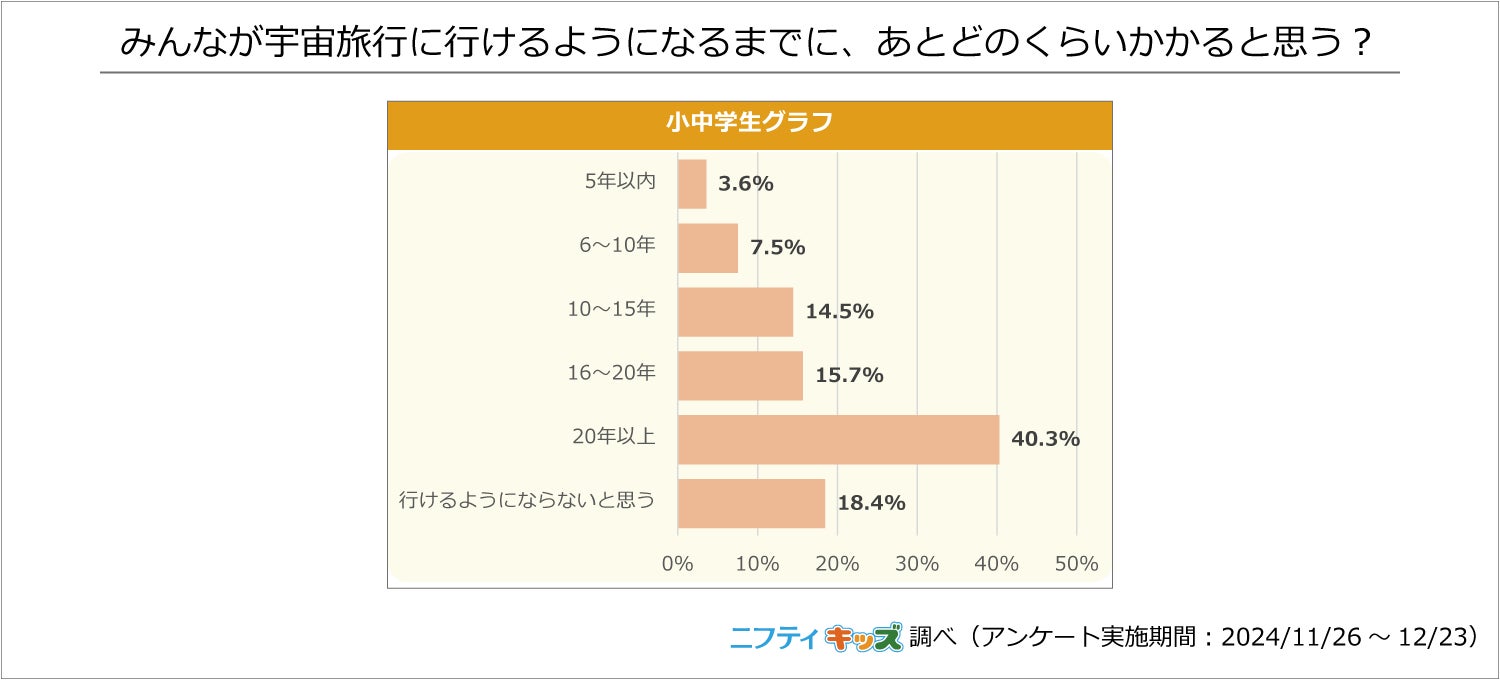 40.3%の小中学生が、みんなが宇宙に行けるようになるには「20年以上かかる」と思っているようです。次に多い回答は「行けるようにならないと思う」でした。