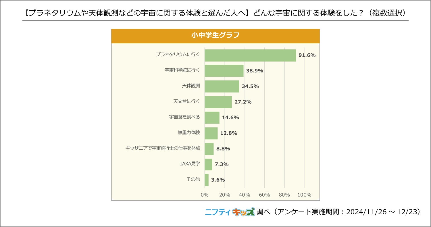 宇宙に興味がある小中学生の91.6%が、宇宙に関する体験として「プラネタリウムに行く」と回答しました。2位の「宇宙科学館に行く」とは差が開いており、プラネタリウムが子どもの宇宙への興味を掻き立てる場所になっていることがわかりました。