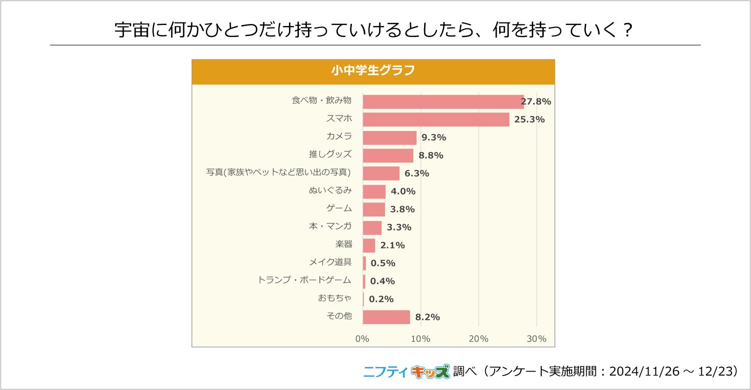 27.8%の人が、宇宙に「食べ物・飲み物」を持っていくという現実的な回答でした。2位は「スマホ」、4位には「推しグッズ」でした。「推しと一緒に宇宙にいきたい」「推しと一緒に宇宙で記念写真を撮りたい」と考える人が多いのかもしれません。
