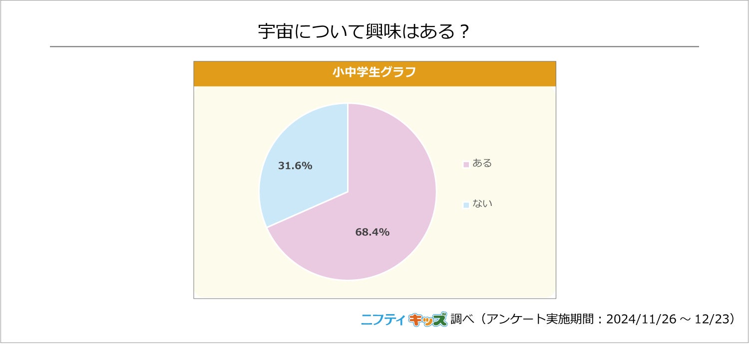 小中学生の68.4%が宇宙に興味が「ある」と回答しました。未だ解明されていない謎が多い宇宙に心惹かれる小中学生は多いようです。