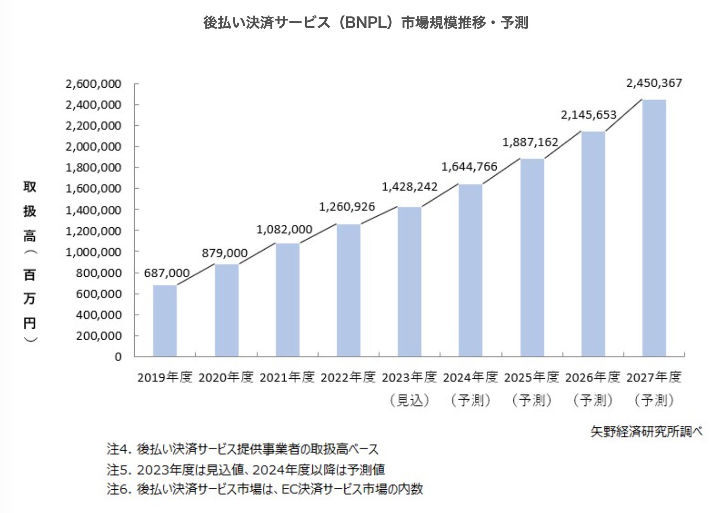 “利用環境の拡大や、決済単価の向上等を背景に、後払い決済サービス市場は、2026年度に2兆円の水準まで拡大すると予測する。”