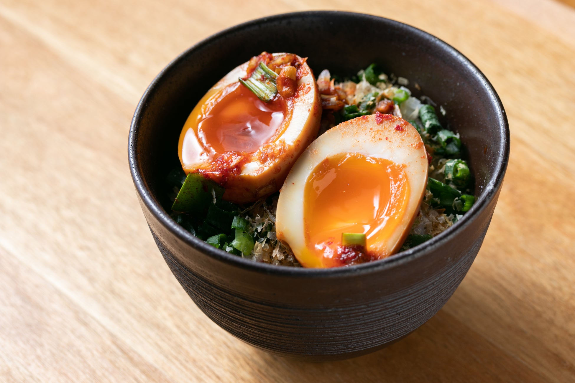 ニラや葱など薬味たっぷりの醤油タレに漬け込んだ半熟卵を、ご飯の上で崩していただく卵かけご飯です。