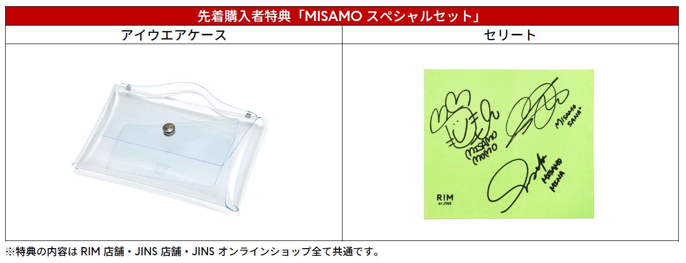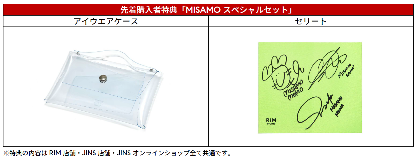 さらに、RIM全店舗とJINSの一部店舗、JINSオンラインショップにて、MISAMOがコンセプトフィルムで着用した対象商品をご購入いただいた方に先着で、オリジナルのアイウエアケースとセリートをプレゼントする「RIM loves MISAMO MUST BUY CAMPAIGN」を開始いたします。