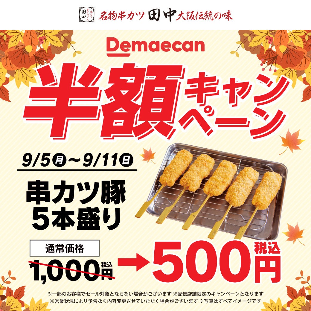 株式会社串カツ田中ホールディングス(本社:東京都品川区東五反田、代表取締役社長:坂本 壽男)は、2022年9月5日(月)から11日(日)の期間限定で、出前館を導入している串カツ田中の店舗を対象に、「串カツ豚5本盛り」の半額キャンペーンを実施します。通常価格1,000円(税込)の「串カツ豚5本盛り」が、出前館でご注文いただくと、500円(税込)になるという非常にお得な企画です。