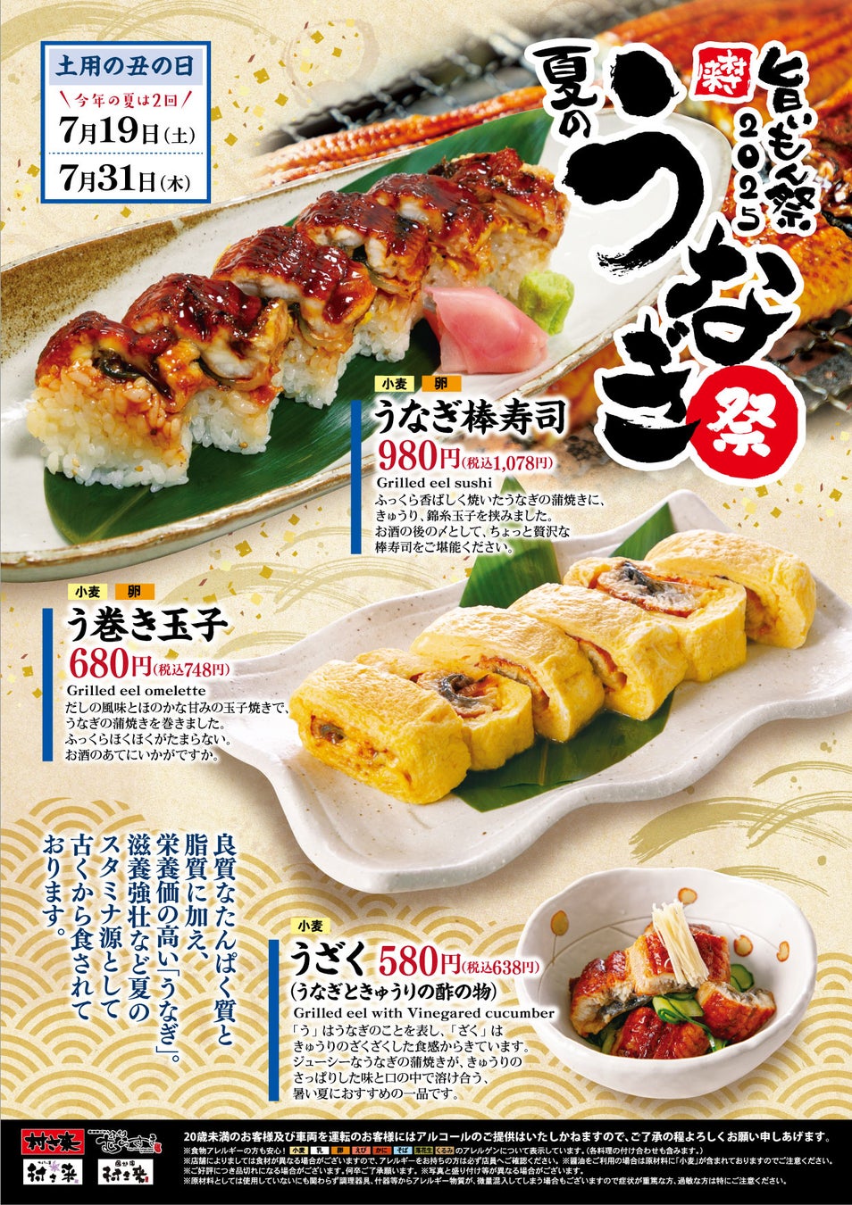 居酒屋「村さ来」八田店(名古屋市)、新大阪店(大阪市)では「旨いもん祭 2025 夏のうなぎ祭」を7月15日(火)から開催いたします。うなぎ料理の定番3種類「うなぎ棒寿司」、「う巻き玉子」、「うざく」をご用意いたします。うなぎのふっくらほくほくの食感をお楽しみください。お酒のあてにもぴったりでございます。皆さまのご来店をスタッフ一同お待ちしております。