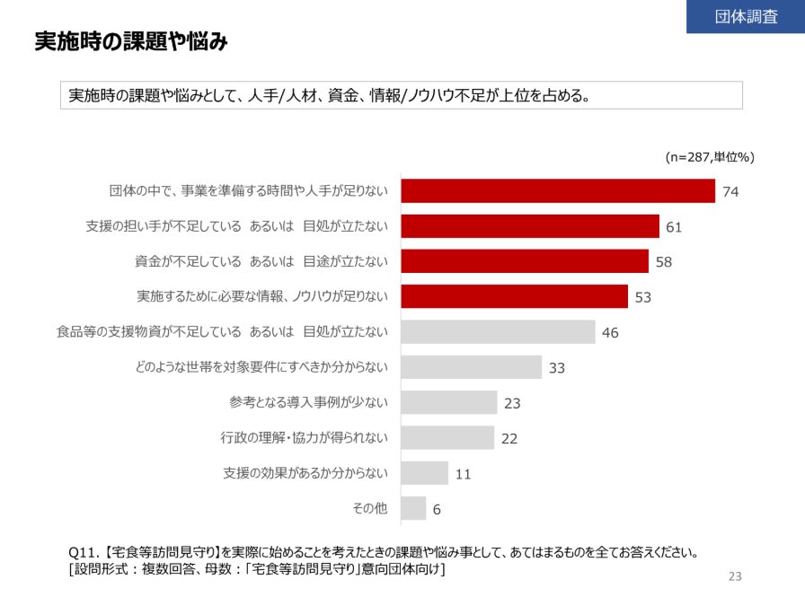 その結果、こども宅食は「支援が必要な家庭の見守りに有効である」と認知されている一方、様々なリソース不足が大きな問題であるとわかりました。