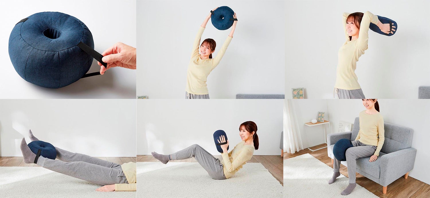 ほどよい重量感があるので、クッションの重さを利用して肩や腹筋のトレーニングも可能!トレーニング時や持つ時にも便利なゴムベルト付。
