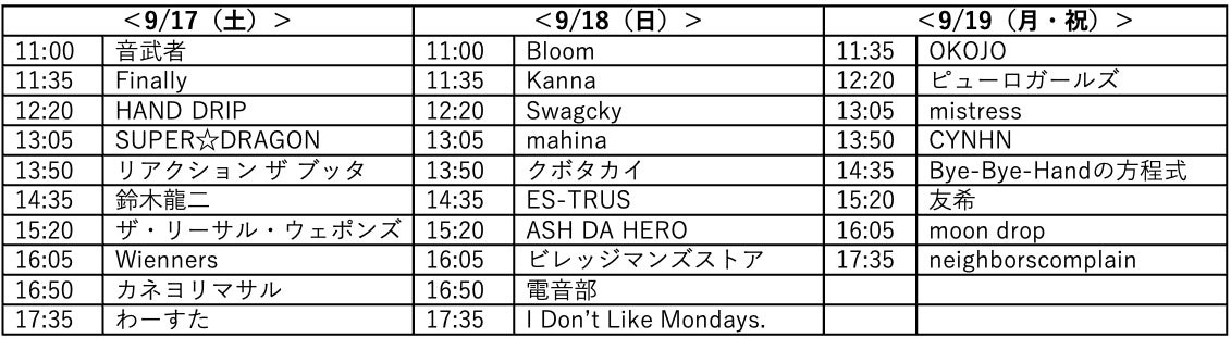 「DISH//」、「アイドルマスター SideM」、「打首獄門同好会」、「MY FIRST STORY」、「UVERworld」、「T.M.Revolution」、「Bloom」、「Kanna」、「Swagcky」、「mahina」、「クボタカイ」、「ES-TRUS」、「ASH DA HERO」、「ビレッジマンズストア」、「電音部」、「I Don’t Like Mondays.」