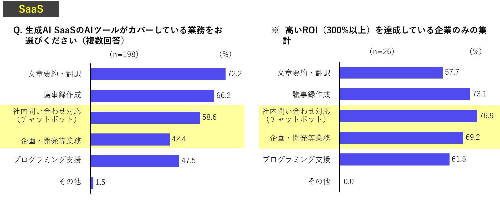 生成AI SaaSを導入している企業に、どのような業務に活用しているか質問したところ、社内問い合わせ対応が6割、企画・開発等業務が4割となりました。また、高ROI達成企業では、これらの業務に導入している例が多いという結果となりました。