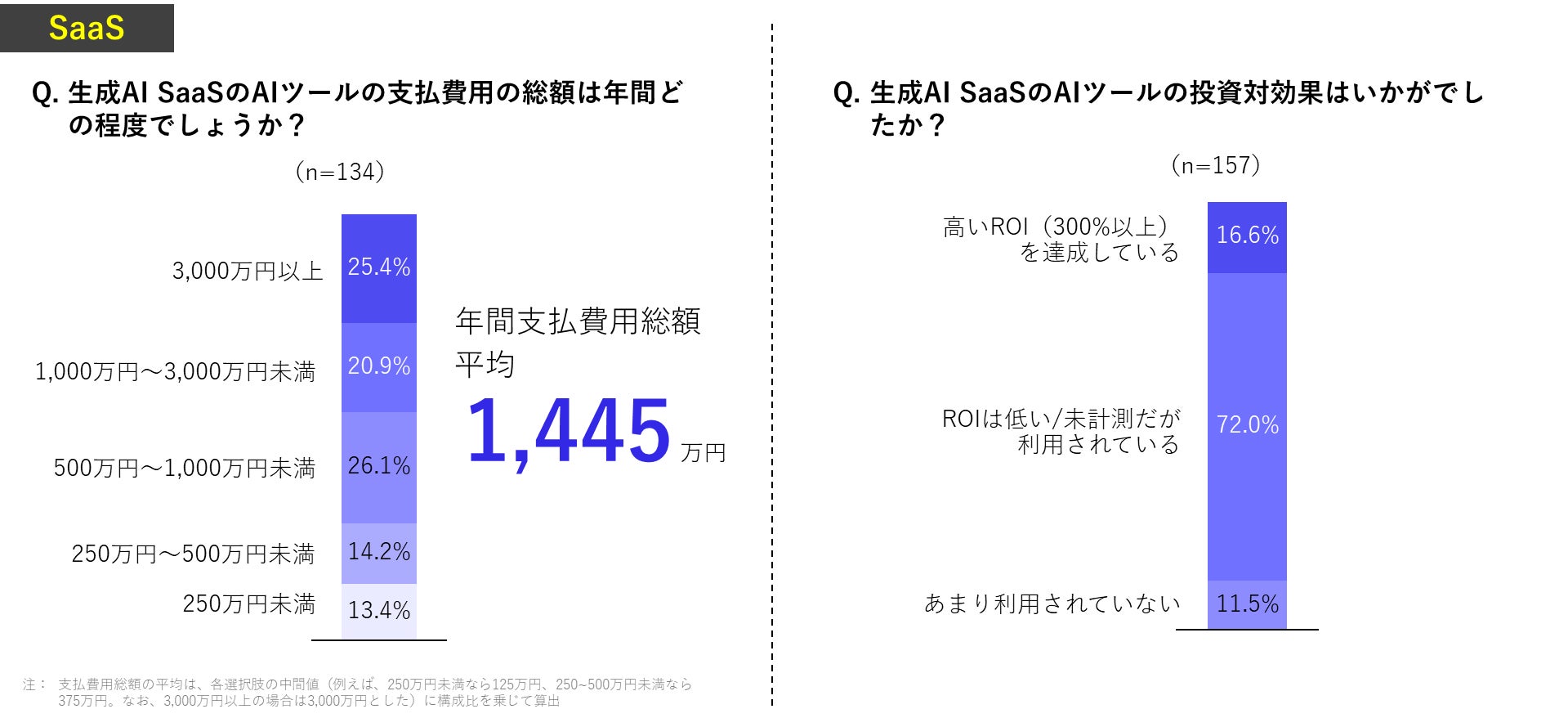 生成AI SaaSを導入している日本の大手企業の年間支払費用の総額は平均1,445万円となり、自社開発の半分以下という結果となりました。また、高いROI(300%以上)を達成できているのは16.6%にとどまりました。