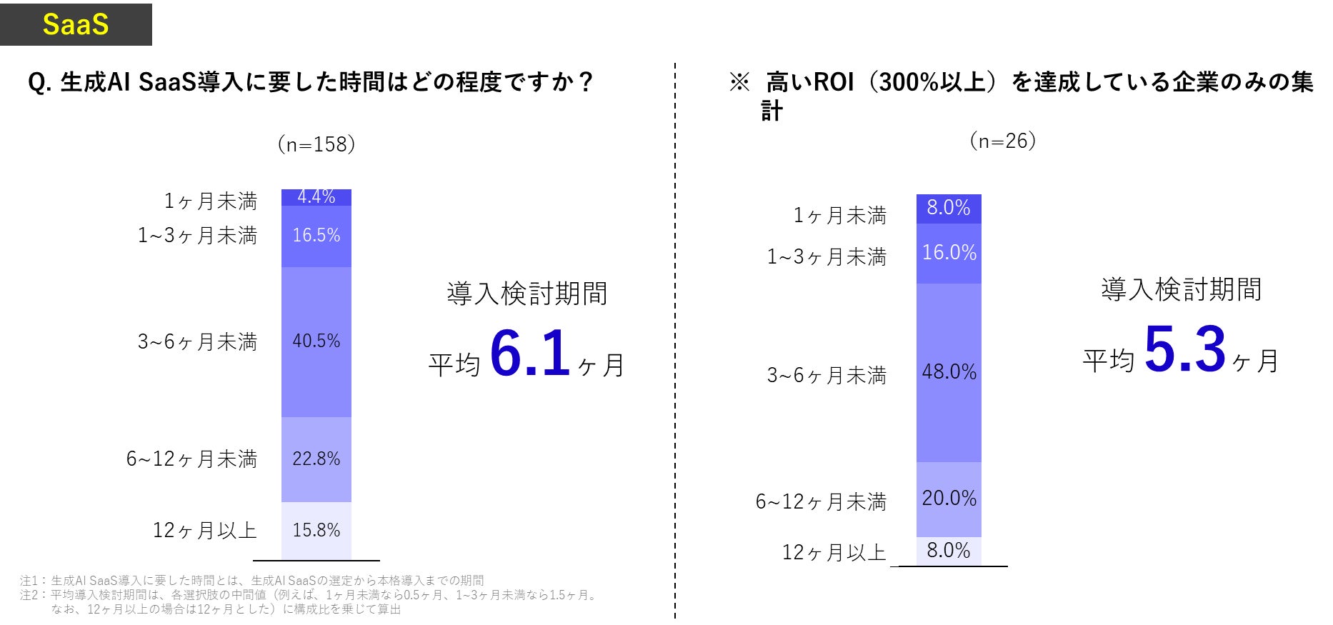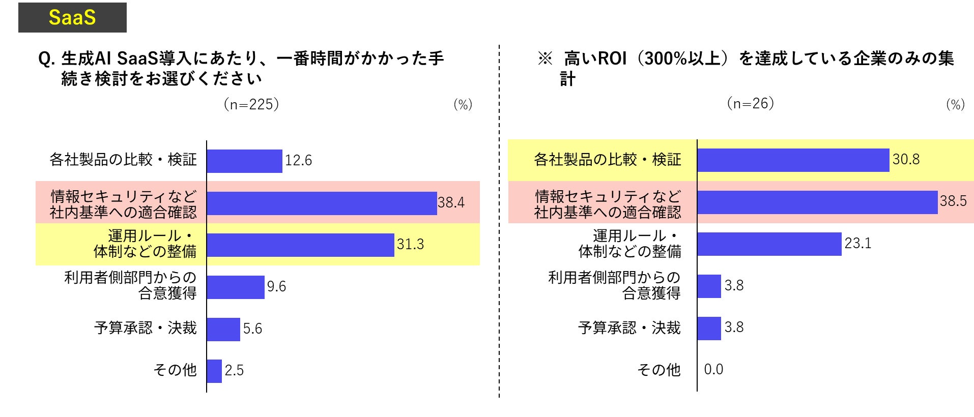 導入に要した時間は平均6.1ヶ月で、高いROIを達成している企業のみで集計した場合は平均5.3ヶ月と0.8ヶ月短いという結果となりました。また、時間を要した手続きは情報セキュリティの対応や社内体制整備となりました。高いROIを達成している企業のみで見ると、「製品比較・検証」の割合が多くなりました。