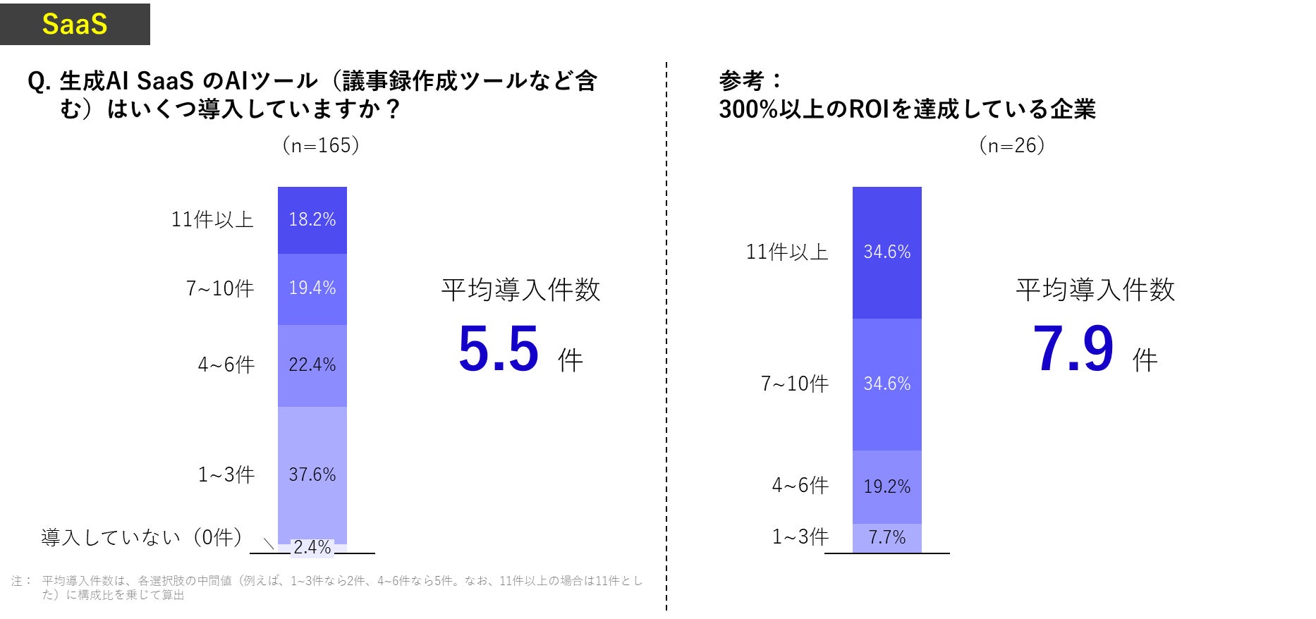 生成AI SaaSの導入数は平均5.5件、高いROIを達成している企業のみで集計した場合は平均7.9件となりました。