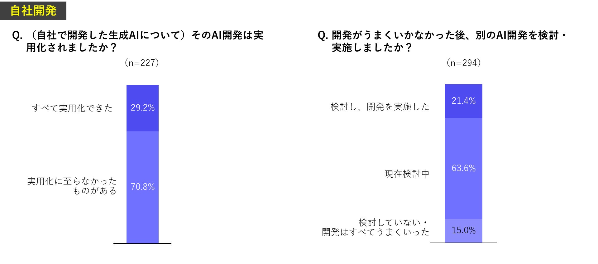 自社開発のうち、実用化に至らなかったものがあるとの回答が7割に達し、その後に再開発した企業は2割にとどまる結果となりました。開発の難易度が高く、実用化に至らないとAI活用の機運を失速させてしまっている現状が浮き彫りとなりました。