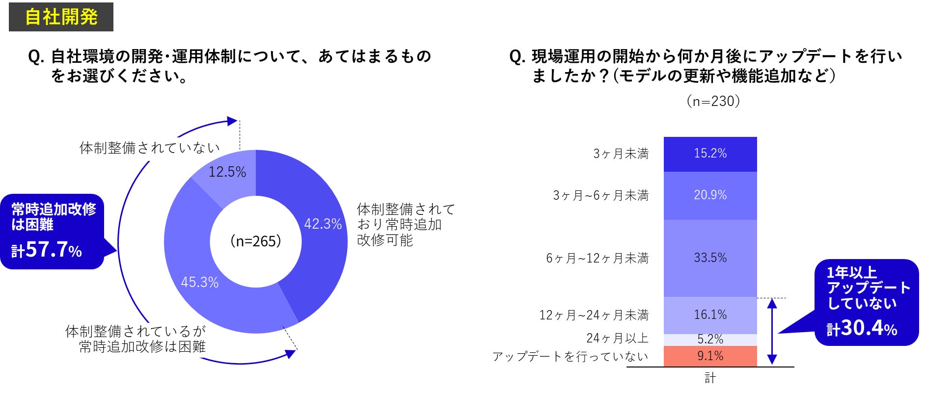 また、常時追加改修が困難な企業は5割以上、開発後に約3割が1年以上アップデートしていないという結果となりました。生成AIの自社開発において多額の投資をした一方で、急激な環境変化に対応できず開発後のシステムが陳腐化してしまっている大手企業も多く見られました。