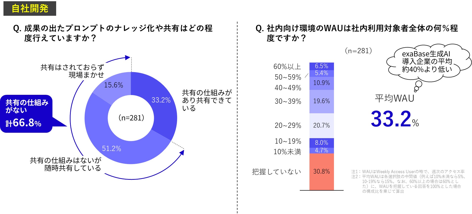 自社開発において、成果がでたプロンプトを共有する仕組みがない会社は6割以上となりました。また、社内利用対象者全体のWAUの平均は33.2%で、WAUを把握していないという企業も3割となりました。平均WAUが40%を超えている当社の「exaBase 生成AI*1」は、カスタムテンプレートなどのナレッジ共有の仕組みを持っています。今回の超結果と比べると高くなっており、利用促進の仕組みが作れていない様子が見えてきました。