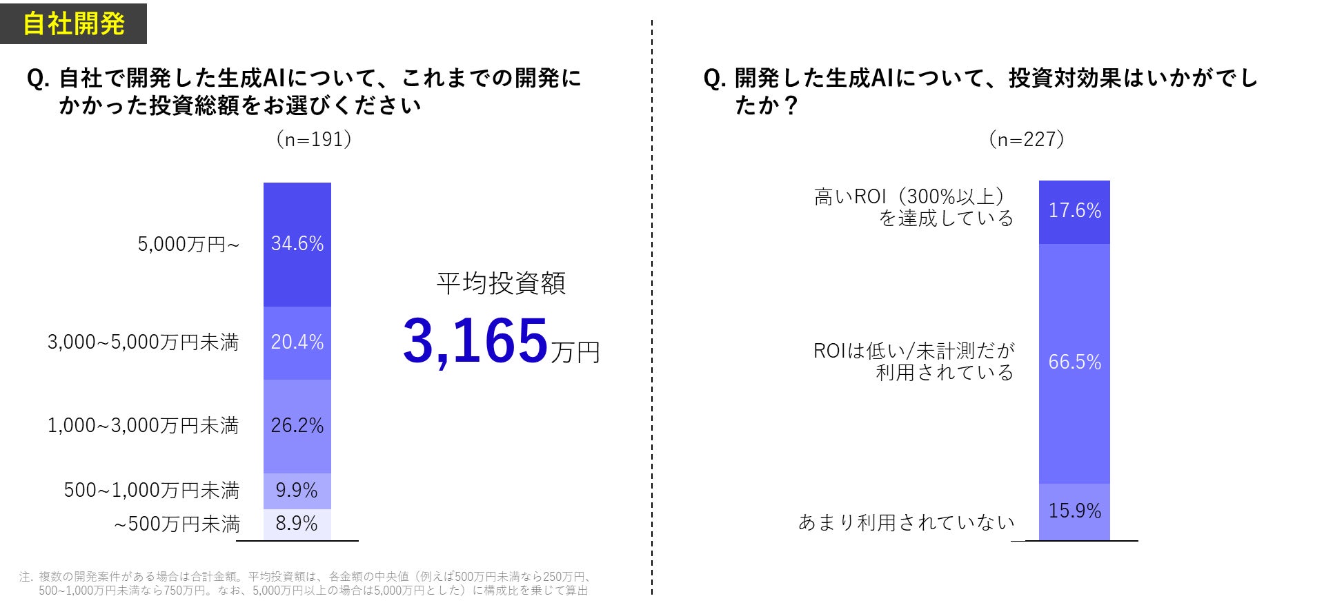 生成AIを自社開発している日本の大手企業は平均3,165万円を投資していました。一方で、高いROI(300%以上)を達成できているのは2割(17.6%)にとどまりました。