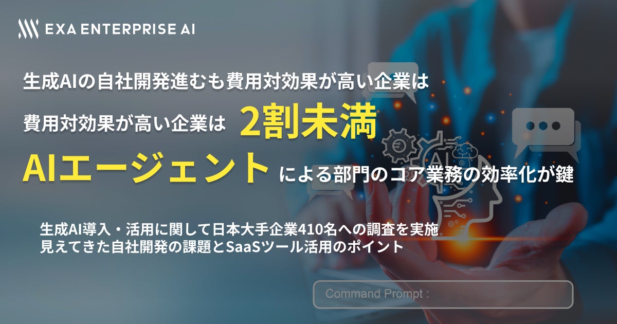 株式会社エクサウィザーズのグループ会社である株式会社Exa Enterprise AI(東京都港区、代表取締役:大植 択真、以下Exa Enterprise AI)は、創業30年以上かつ従業員数300人以上の企業(以下日本の大手企業)へ「日本の伝統的大手企業におけるAIの自社開発やツール導入・活用調査」を実施し、410名から回答を得ました。その結果、自社開発に平均3,165万円が投じられる一方で、高い費用対効果(ROI)を達成できているのは2割未満という結果となりました。また、AIエージェントを含めた生成AI SaaSツールをより活用するためには、各部門のコア業務に早期に導入していくことがポイントであることが見えてきました。