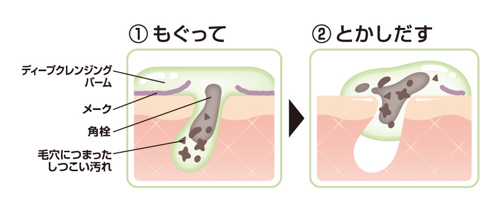 クレンジングバームが肌に触れると体温でとろけ、オイルに変化。ナノサイズ※1のオイルが大人の深い毛穴のすみずみまでもぐりこみ、毛穴の奥に詰まったメークを溶かし出します。さらに、厳選した植物オイル※2が角栓を柔らかくし、メークも毛穴汚れもこすらずすっきりオフ。うるおいのあるすべすべ肌に導きます。