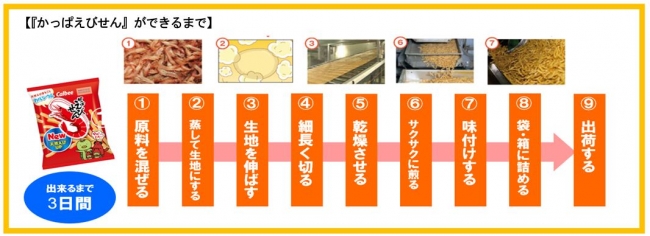 ●『かっぱえびせん』は、天然えび・小麦粉・植物油・食塩などのシンプルな原材料でつくられています。
