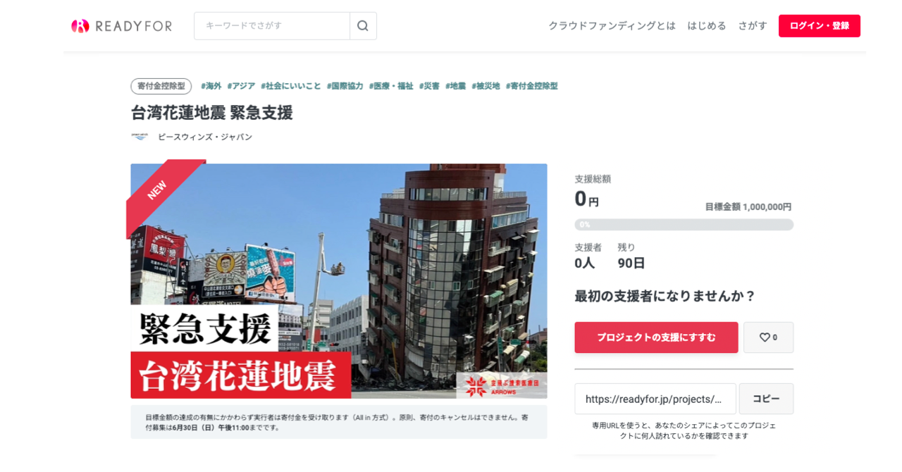 ・ページURL:https://readyfor.jp/projects/Taiwan-earthquake