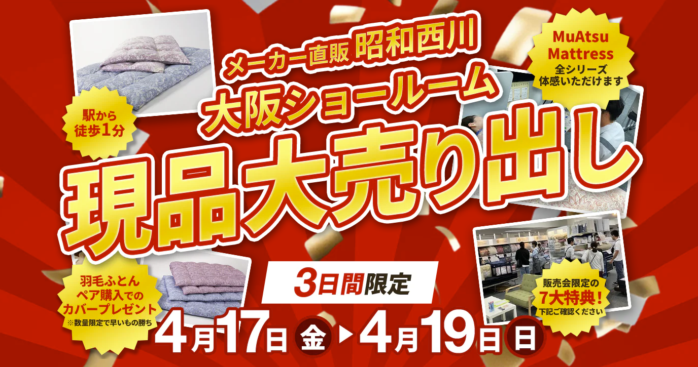 MuAtsu(ムアツ)をはじめ、多彩な寝具を展開する昭和西川株式会社(所在地:東京都中央区、代表:西川元一朗)は、今の時期だからこそお得に選べる羽毛ふとんを中心に、寝具を特別価格で提供する大阪ショールーム限定セールを実施します。2026年4月17日(金)~19日(日)の3日間限定開催です。