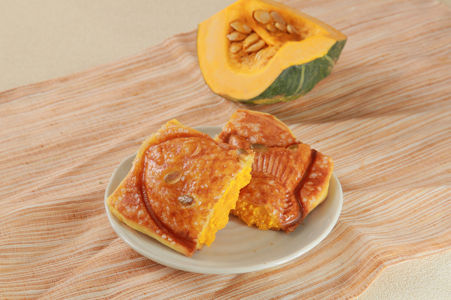 クロワッサンたい焼『かぼちゃあん』は、 “かぼちゃ本来の自然の甘み” を感じられるよう皮以外まるごと使用し、しっとり、ほくほくとした食感を生かした食べ応えがあるたい焼で、オリジナル生地には北海道産のかぼちゃペーストを練り込み、表面(片面のみ)にはザラメ糖とかぼちゃの種をトッピングし、 “サクッ” と香ばしく焼き上げました。