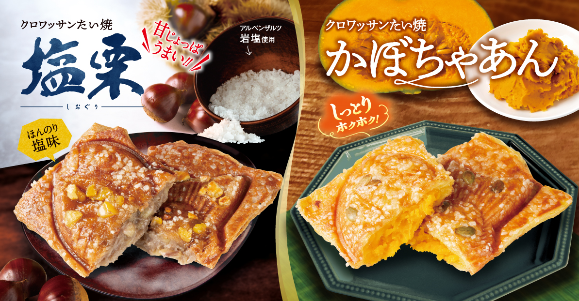 また、たい焼専門店 『銀のあん』 http://www.ginnoan.com/store/ では、9月30日より、クロワッサンたい焼 『塩栗』・『かぼちゃあん』、薄皮たい焼 『甘栗あん』 を発売!専門店ならではの商品ラインナップで、