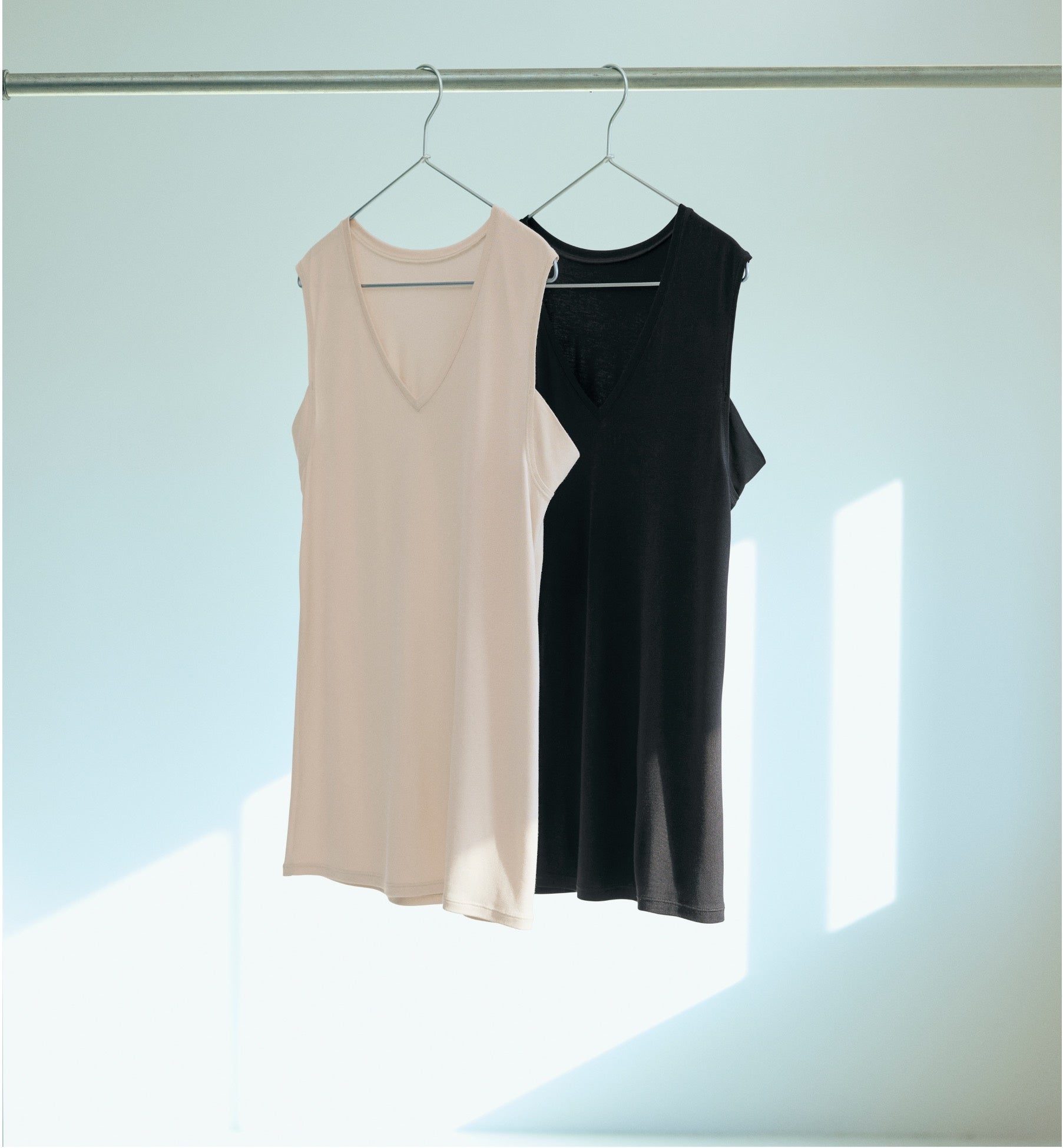 特殊機能繊維「SELFLAME®」を使用。モダール素材による滑らかで心地よい肌触りと、通気性・吸放湿性に優れた設計で、蒸し暑い日でもムレにくさを実現しました。肌面から表面に汗を吸い上げ拡散する2層構造により、肌面はさらっと、汗による冷えの不快感も軽減。程よいストレッチ性のある薄型生地で、理想的なコンディションを維持するインナーウェアです。