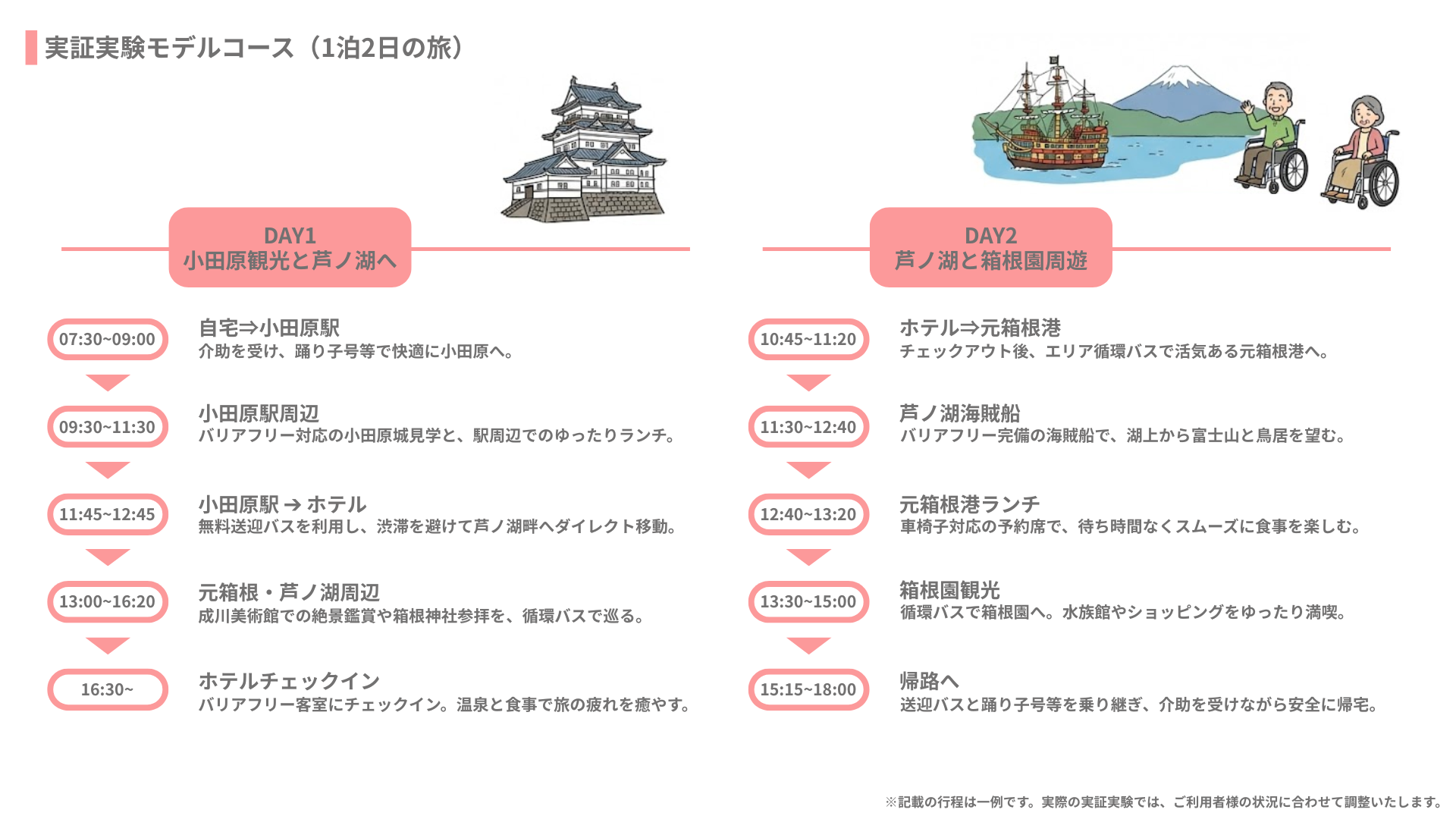 本実証実験では、要介助者およびそのご家族に実際に箱根旅行を体験いただき、利用者の心理的・物理的ハードルの解消、迎え入れる側のオペレーション最適化、利便性の向上、継続可能なビジネスモデルとしての妥当性を検証します。