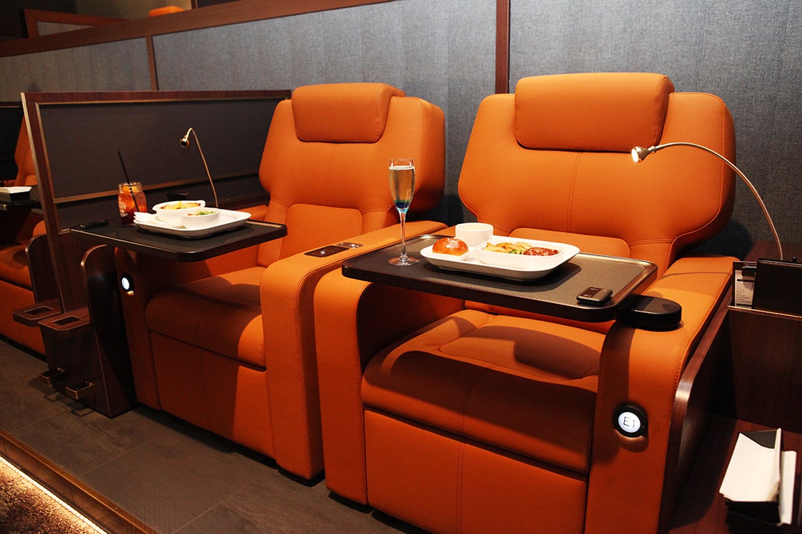 ▲ユナイテッド・シネマ・キャナルシティ13(福岡)で実施している「プレミアム・ダイニング・シネマ」。映画を見ながら食事とお酒を注文して楽しむことができる日本初の試み。