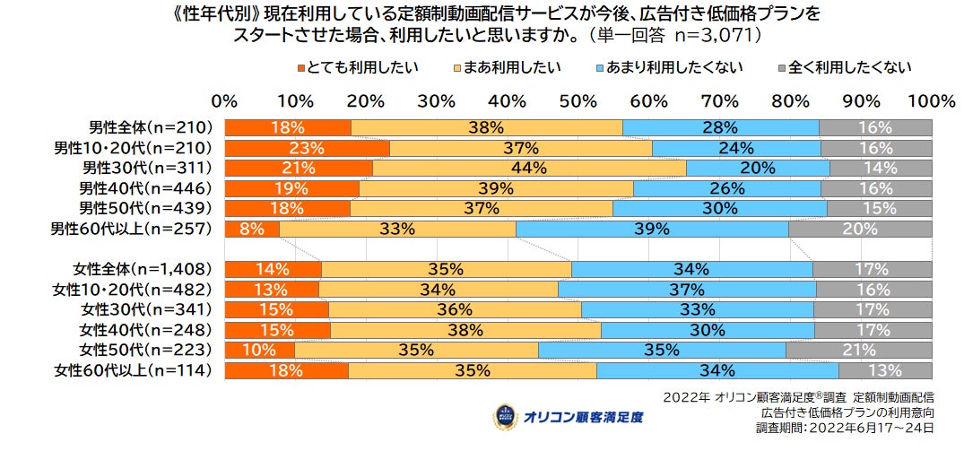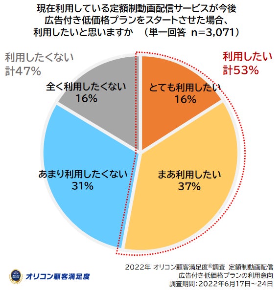 なお今回、2022年の回答者3,071人(調査期間6月17~24日)を対象に、「現在利用している定額制動画配信サービスが『広告付き低料金プラン(視聴動画に広告が表示される代わりに定価を抑えた料金プラン)』をスタートした場合の利用意向」を聴取したところ、「とても利用したい」(16%)、「まあ利用したい」(37%)の合計が53%と過半数に達しました。
