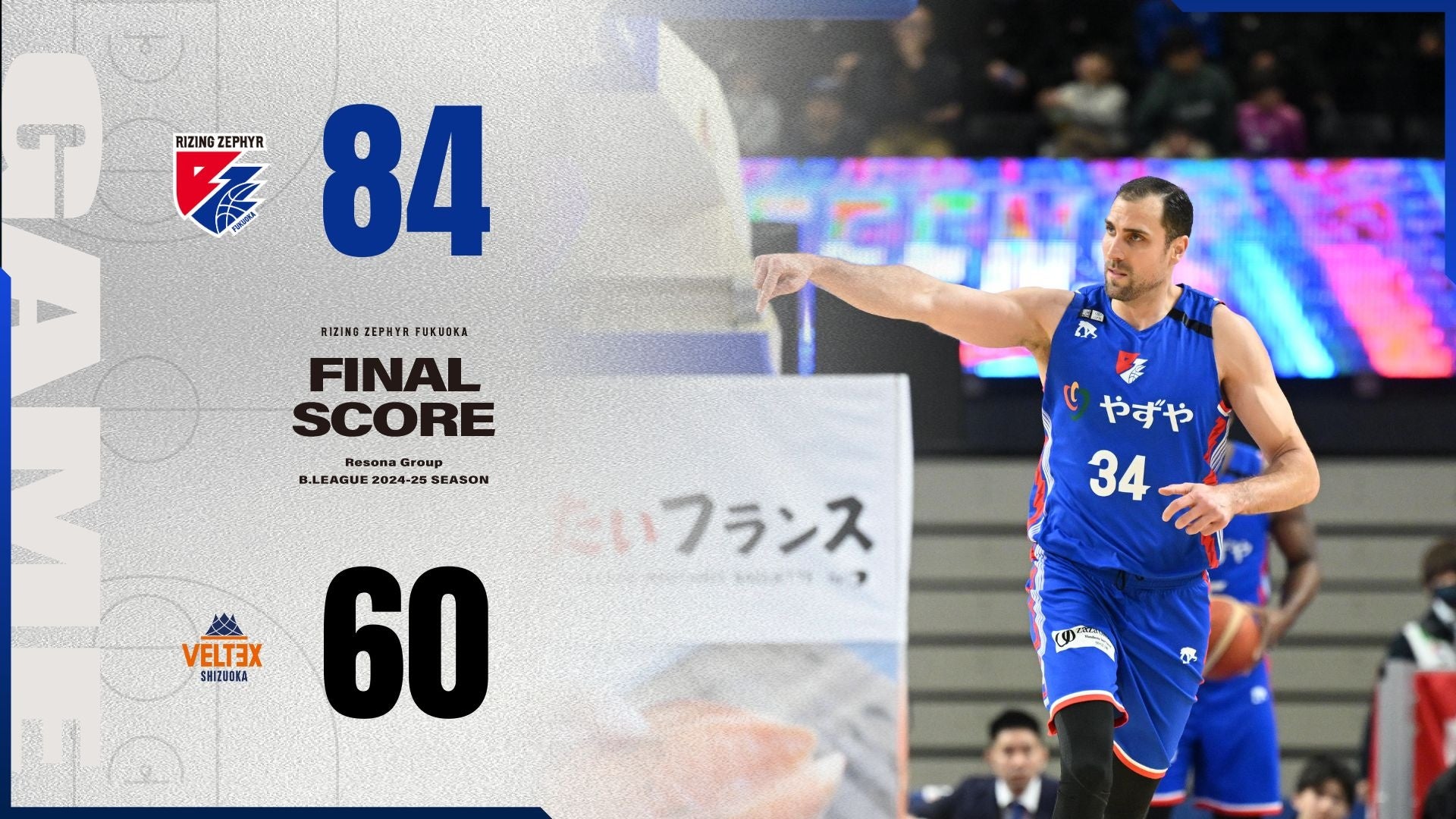 2025年3月8日(土)に開催した、りそなグループB.LEAGUE 2024-25シーズン【ライジングゼファーフクオカvs.ベルテックス静岡】において“福岡84-60静岡”で福岡の勝利となりました。