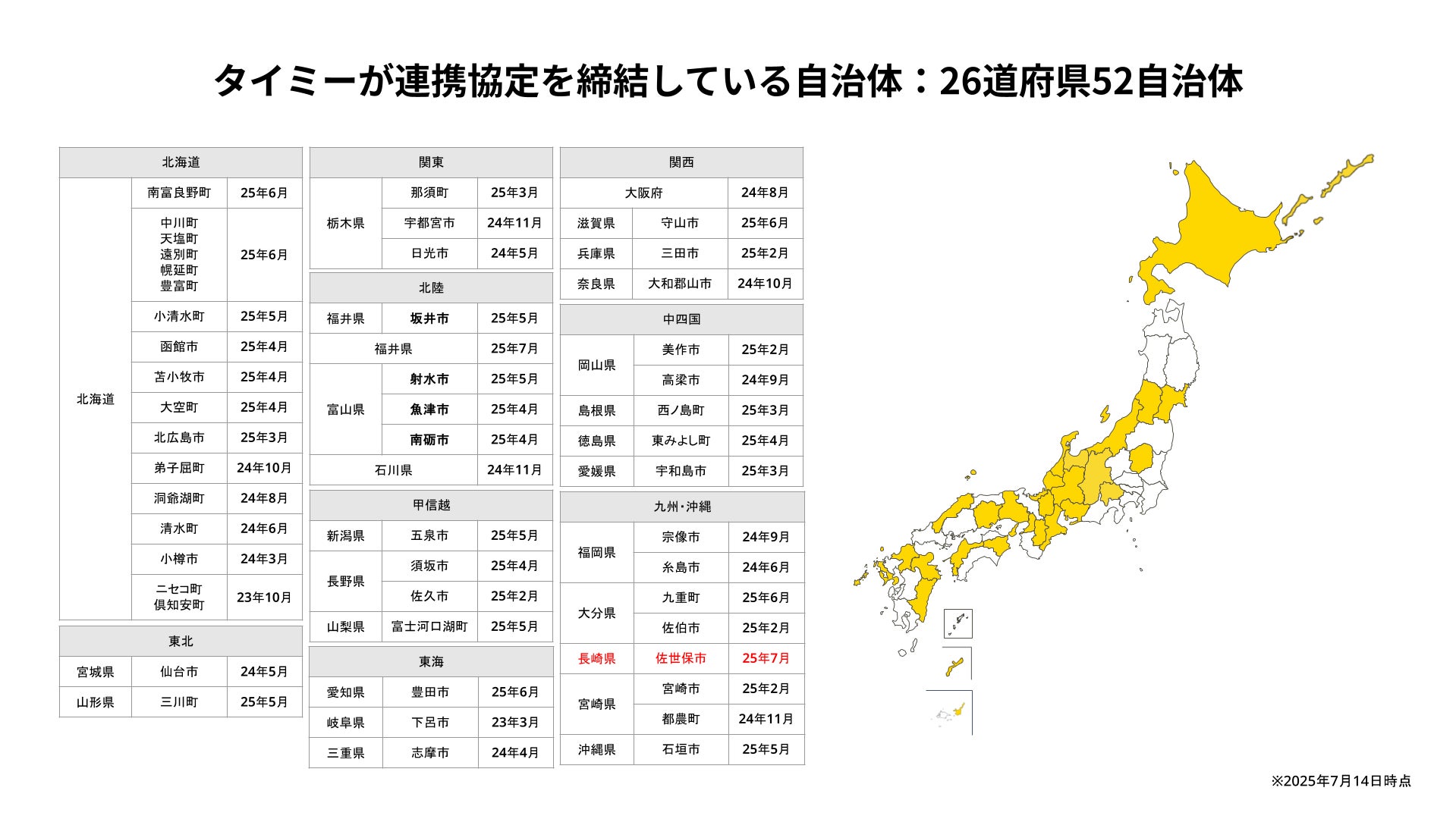 当社はこれまで25道府県・51自治体と連携協定を締結しており、今回の佐世保市との連携は26道府県・52自治体目となります(※)。なお長崎県における自治体連携は、今回が初となります。