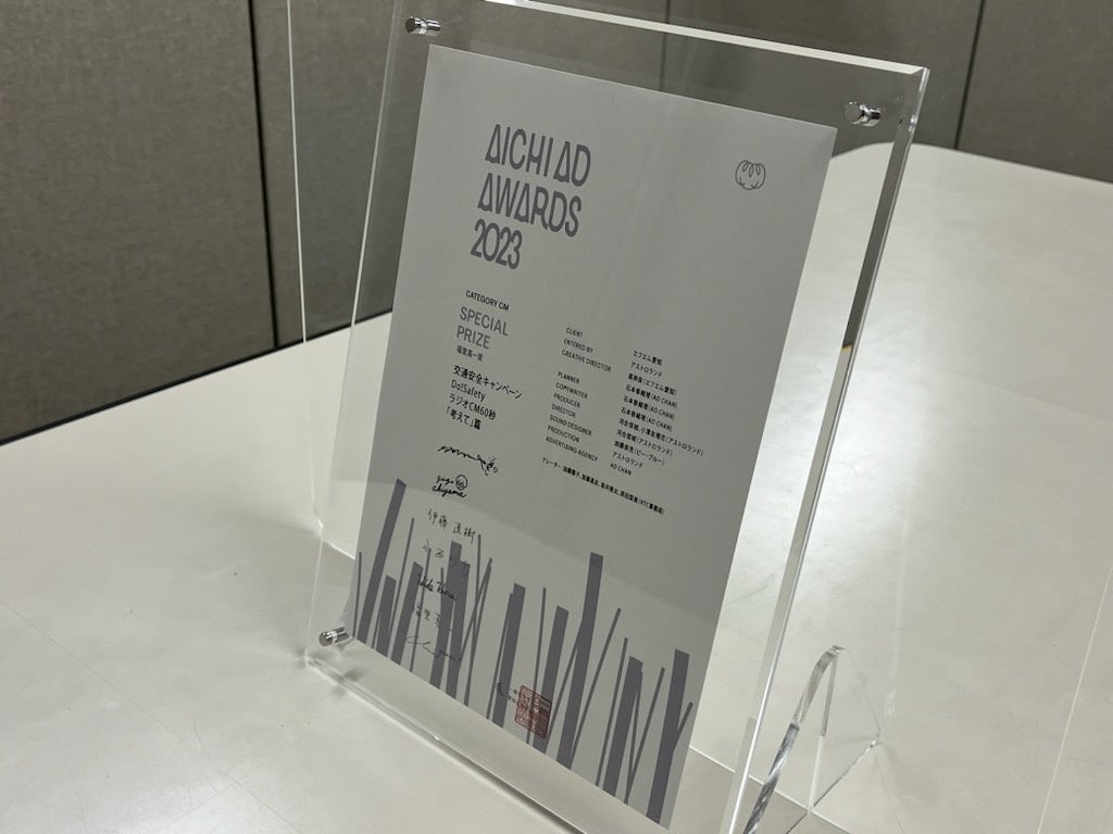 7月19日(水)に行われた、AICHI AD AWARDS 2023の表彰式にて、FM AICHIで制作、放送されたラジオCM 「FM AICHI セーフティ・ドライバーズ・キャンペーン Do! Safety 『考えて』篇」が、特別賞(福里真一賞)を受賞致しました。