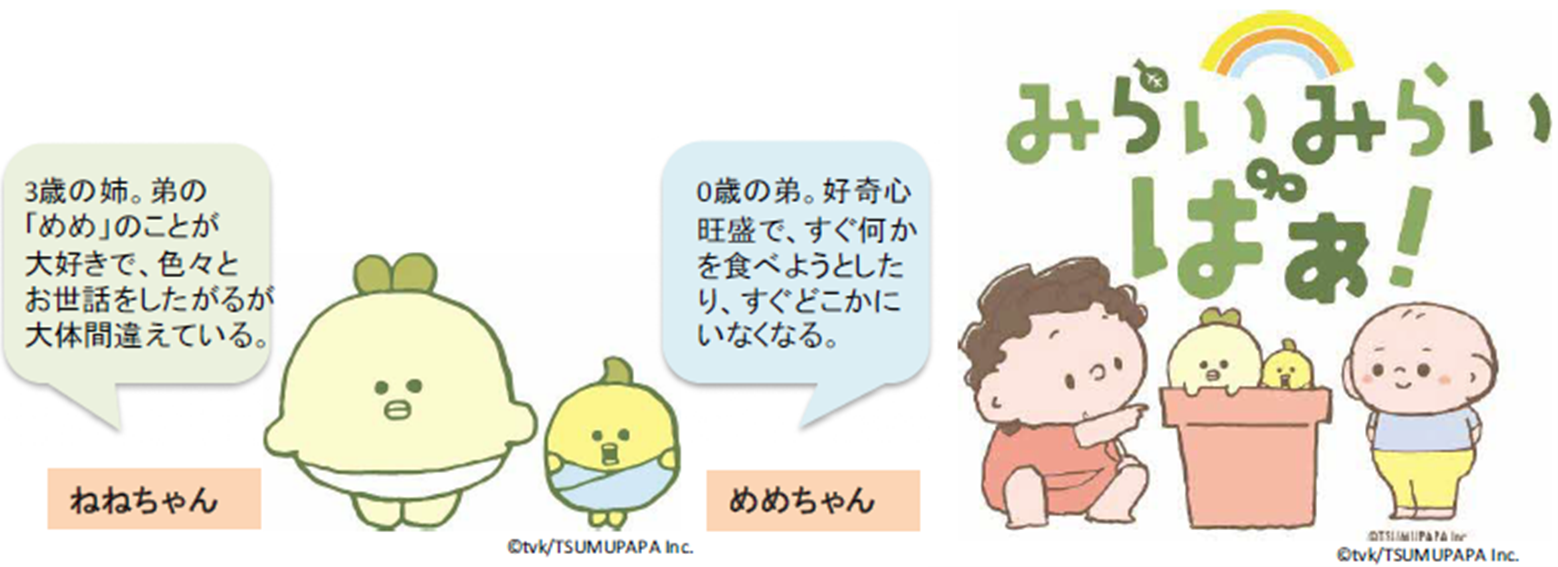 | プロジェクト名: つむぱぱアニメを起点とした「かながわMIRAIプロジェクト」子育て家庭向けコミュニティの拡大と活性化 実施企業: 株式会社つむぱぱ社(本社:東京都目黒区、以下つむぱぱ) 株式会社テレビ神奈川(本社:横浜市中区、以下tvk) 概要: tvkでは、これまで神奈川の子育て支援事業「かながわMIRAIプロジェクト」に取り組んできました。 今回、子育て世代に人気のクリエイター「つむぱぱ」とのコラボレーションにより、オリジナルコラボキャラクター「ねねちゃん」ファミリー(神奈川に住んでいる3歳の女の子「ねねちゃん」と弟の「めめちゃん」、ぱぱ、ままの4人家族)が誕生しました。今後、tvkでは ・彼らが登場するショートアニメ「みらいみらいばぁ」の放送(各種親子イベントに登場) ・SNSで話題の「つむぱぱ」ファミリーとの交流 などを予定。さらに今後、子育て家庭を集めて悩み相談や情報共有を行い、お互いが繋がる機会となるイベントを開催するなど、神奈川における子育て支援コミュニティの構築を目指していきます。 |