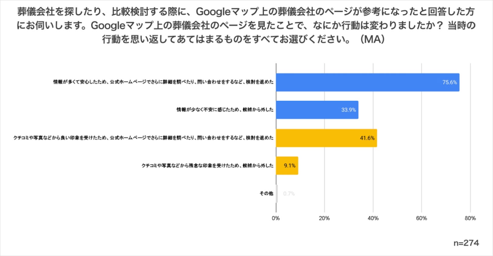 Googleマップで葬儀会社のページを閲覧した消費者のうち、75.6%が「情報が多くて安心したため、検討を進めた」と回答しました。