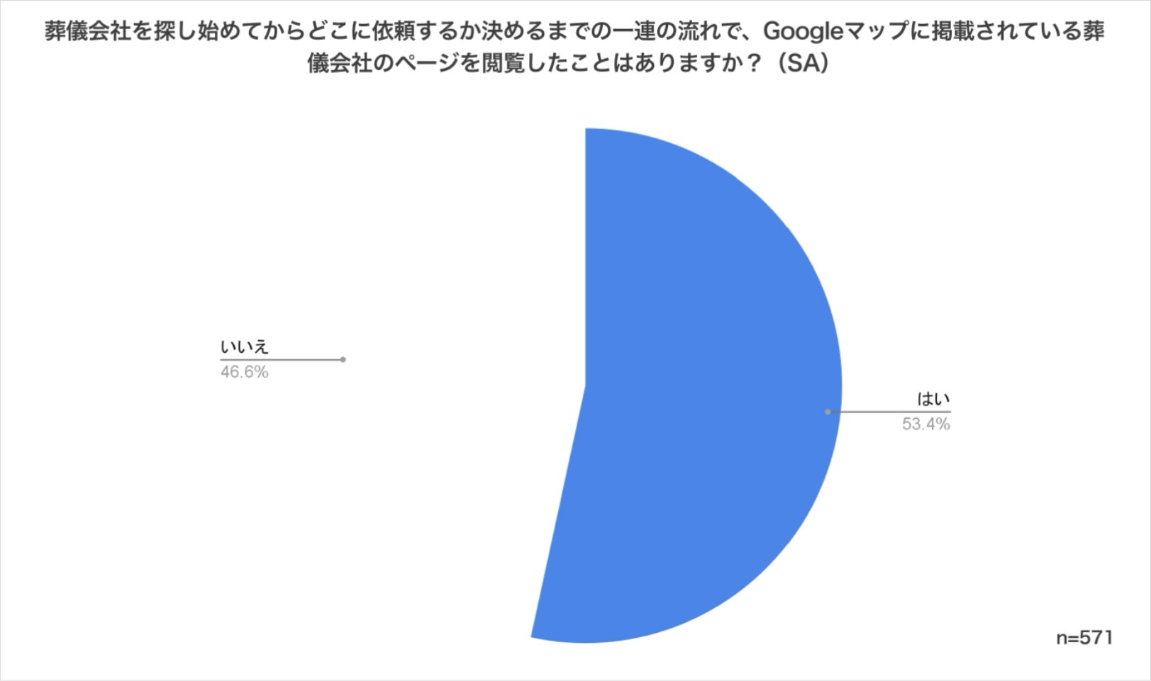 葬儀会社を探し始めてからどこに依頼するか決めるまでの一連の流れの中で、「Googleマップに掲載されている葬儀会社のページを閲覧したことがある」と回答した人は53.4%にのぼりました。