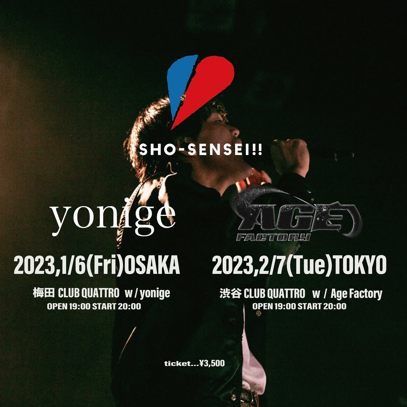 今回のツアーは、SHO-SENSEI!!自身の憧れるアーティストを呼んでの対バン形式のライブ。大阪公演では“yonige”、東京公演では “Age Factory”の出演が決定した。チケットは、本日11月11日(金)12:00よりイープラスにてプレオーダー受付を開始する。