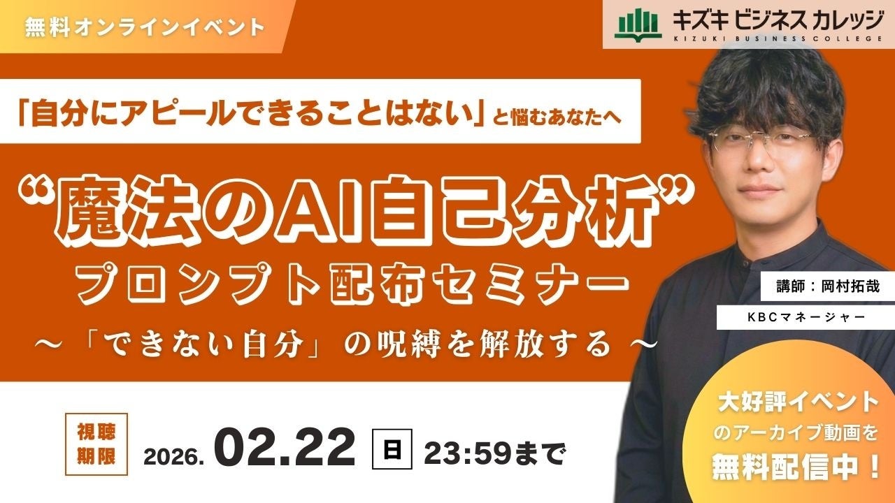 就労移行支援事業所・キズキビジネスカレッジ(KBC)は、2026年1月20日(火)に開催した、AIを使ってできない自分の呪縛を解放して、できる自分を再発見するための無料オンラインセミナーの様子を収めたアーカイブ動画を配信いたします。