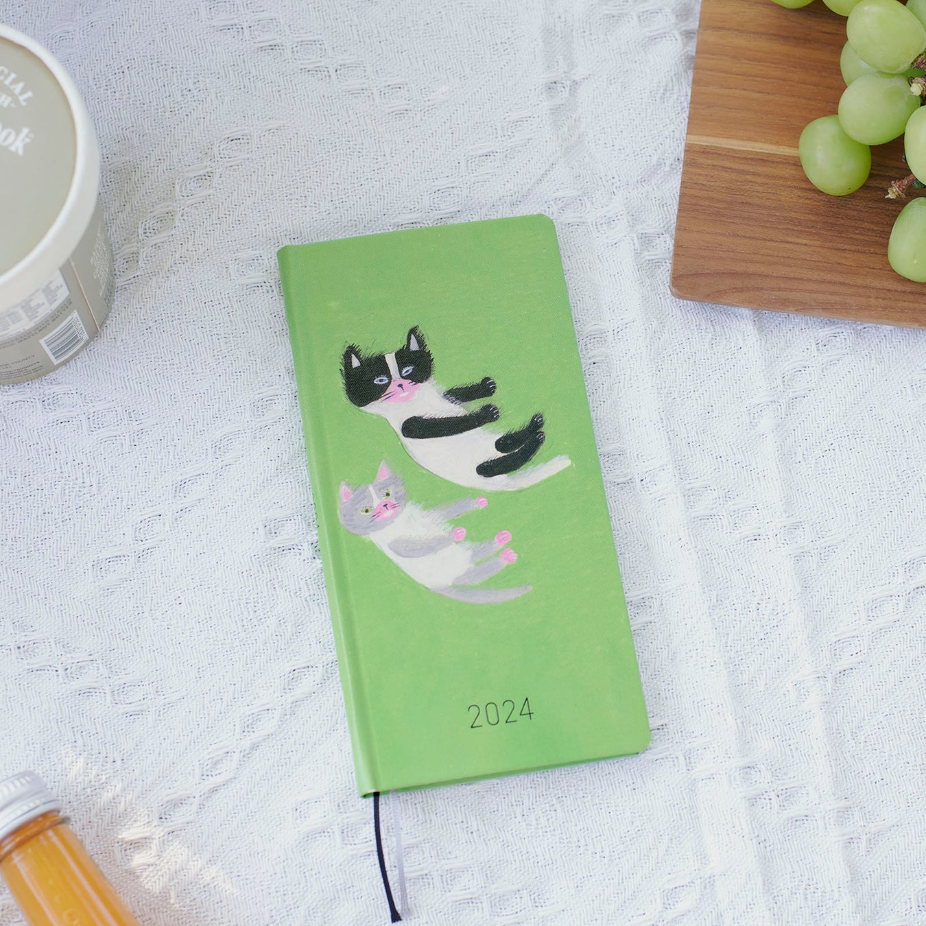 柴田ケイコさんが、2022年に「風」をテーマに描いたシリーズ作品が、ほぼ日手帳になりました。オリジナルサイズの手帳カバーには、ビューンと空を舞う食パンの上に乗った猫たち、カズンサイズの手帳カバーには、夜のたんぽぽ畑にそよ風が吹く美しい光景をうっとりと眺めるクマと猫、週間手帳のweeksには、原っぱに吹きつける強い風で、ふわふわと浮かんでしまった子猫たちが描かれています。その他、下敷きや方眼ノートなど、手帳と使えるオリジナル文具もご用意しています。