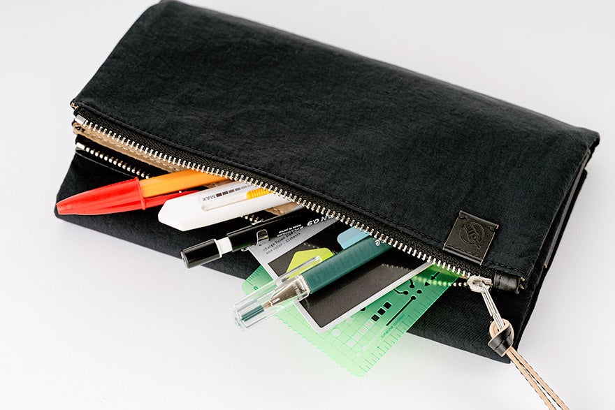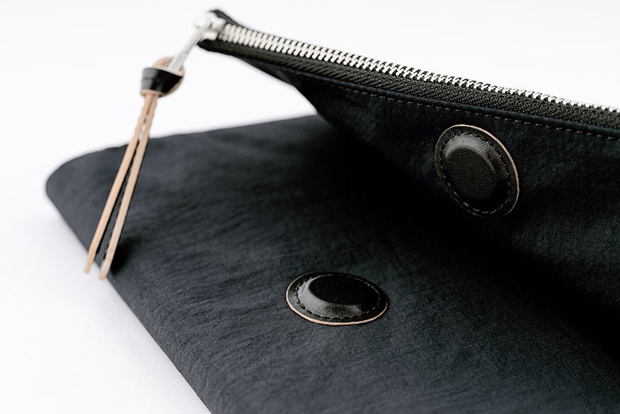 手帳といっしょに、文具など大切なツールを持ち運べる、スマートな手帳カバーを作りました。名前は「tragen(トラ―ゲン)」。ドイツ語で「持ち運ぶ」という意味です。たっぷり入るポケットが特長ですが、見た目はどこまでもシンプルでスマート。マグネット仕様の三つ折りながら、軽やかな持ち心地であることもポイント。かざらないのにかっこいい、そんなさりげない美しさを目指しました。生地は、上品な光沢のあるやわらかなナイロンで、表にはレザーの引き手がついています。3つのサイズで新登場です。
