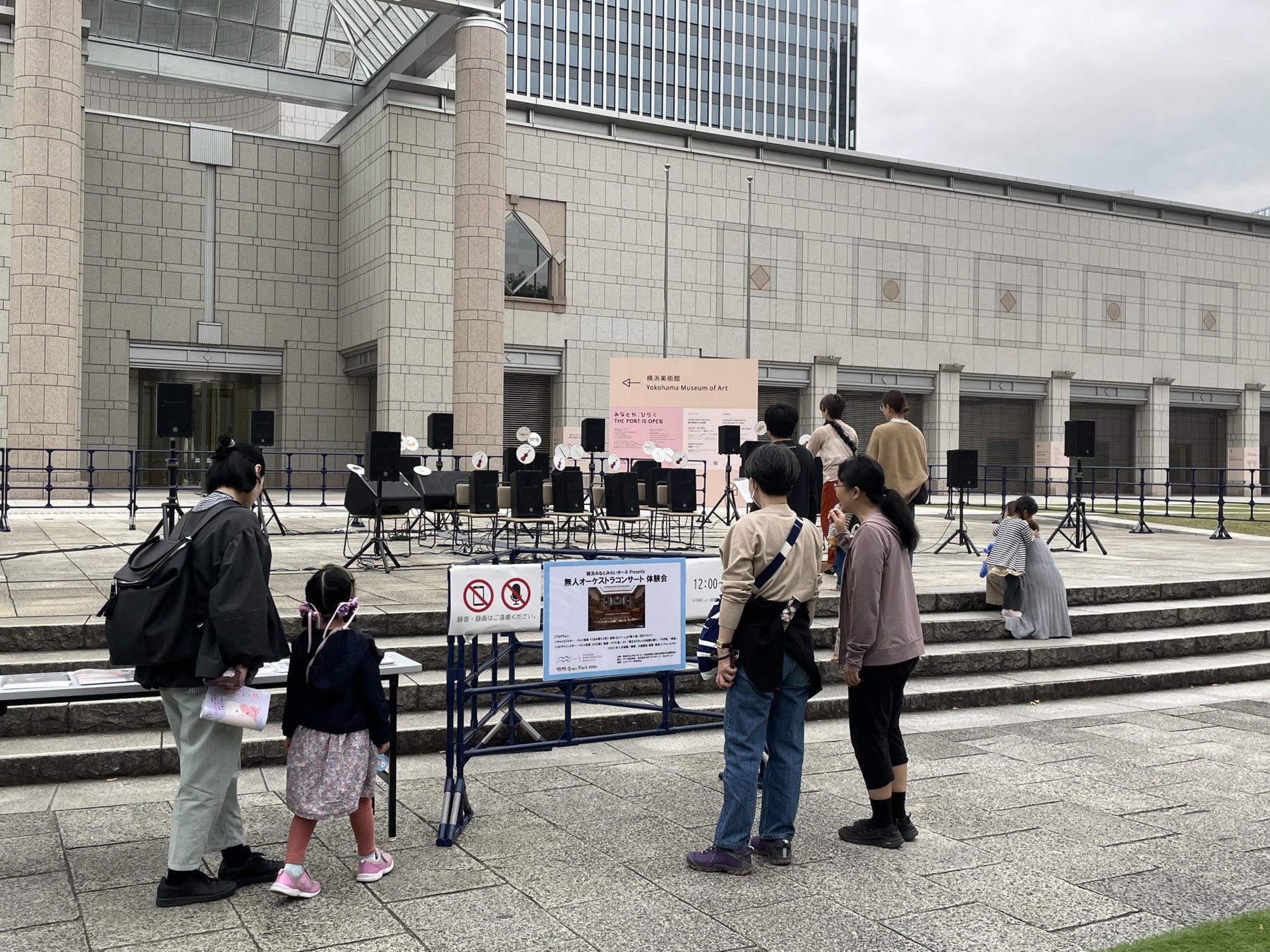 オーケストラの各奏者の生演奏をメンバーひとりひとりにマイクを設置して収録。その音源を収録時の奏者と同じ位置に設置したスピーカーから出力することによって、まさにいまそこでライブで演奏されているような立体的な演奏が体験できる「無人オーケストラコンサート」。客席を移動したりスピーカーに近づいたりと、聴く位置や楽器による響きや音のパワーの違いを聴き比べることができます。本年もこのプロジェクトの音響チームが横浜みなとみらいホールを飛び出して屋外のステージにスピーカーを設置。横浜みなとみらいホールの響きを体験いただけます。