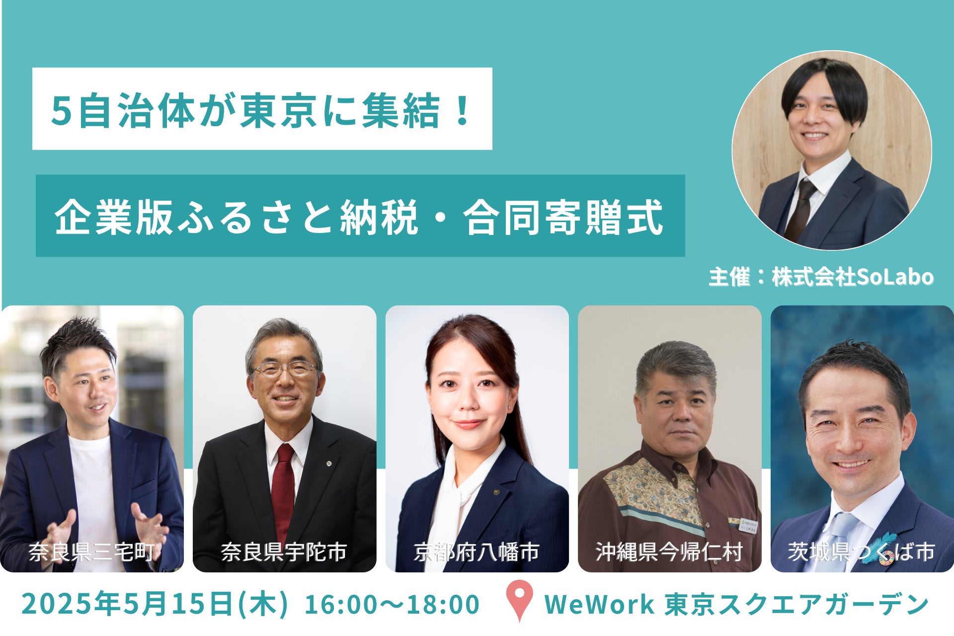 株式会社SoLabo(本社:東京都渋谷区、代表取締役 田原 広一、以下ソラボ)は、2025年5月15日にWeWork 東京スクエアガーデンにて「企業版ふるさと納税 合同寄贈式」を開催いたします。