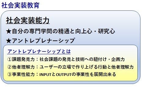 また、社会実装教育の内容である専門性の知識に加え、①課題発見力、②他者理解力、③事業性能力は組織社会で活動する社会人や起業をする方々にとってなくてはならない能力で有り、仕事を効率よく効果的に推進するために参考となる考え方や指針を提供します。