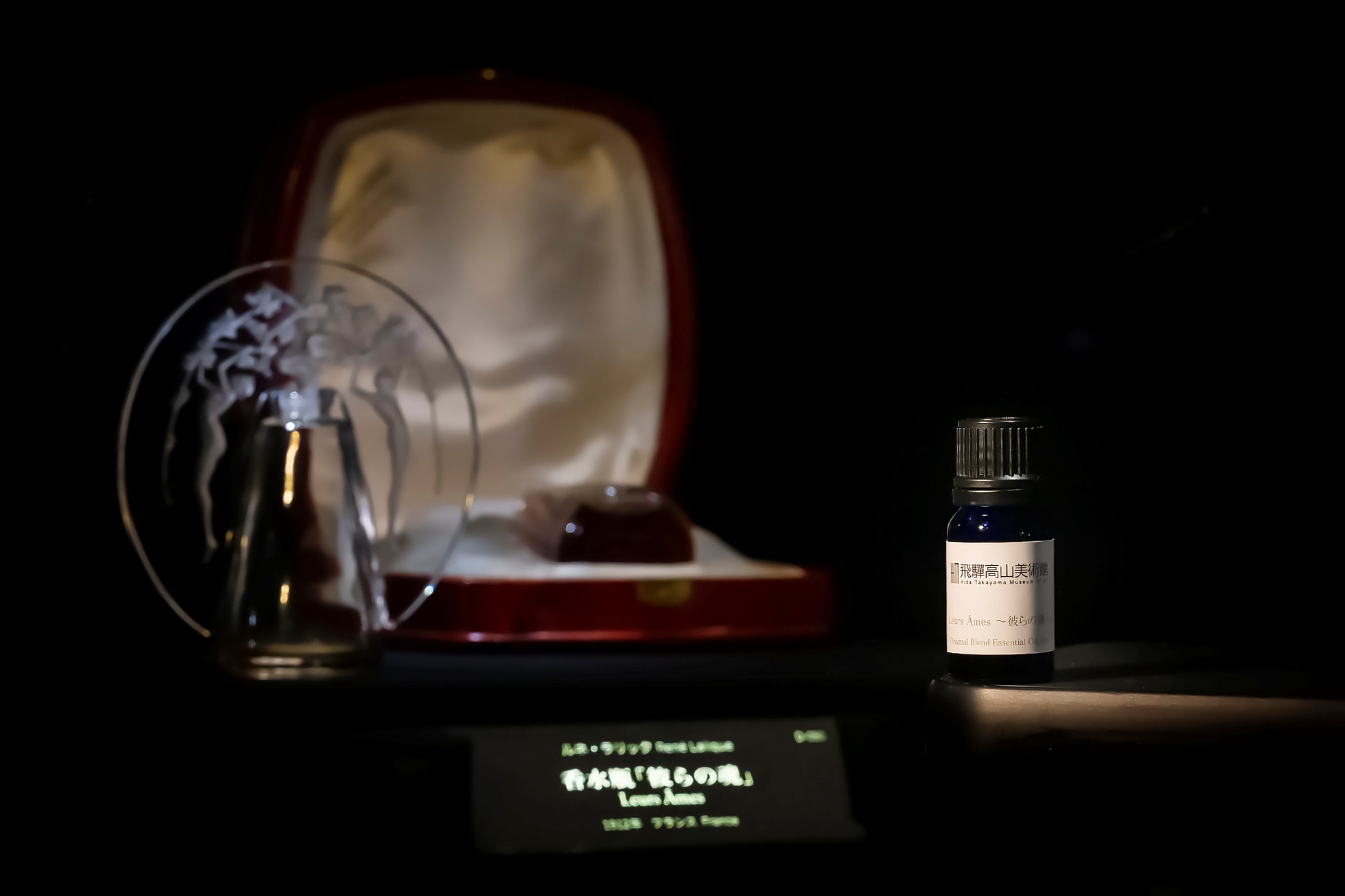 香りは、ふとした瞬間に情景や感情を呼び起こし、館内で感じた静けさや光の移ろい、作品と向き合った時間を、日常の中で静かによみがえらせます。本オリジナルアロマオイルは、当館収蔵作品のひとつであるルネ・ラリックによる香水瓶《彼らの魂(Leurs Âmes)》から着想を得て開発されました。本作は1913年、ラリックがドルセー社のために手がけた香水瓶で、花綱で結ばれた2人の裸婦は愛と魂の結合を象徴し、香りの世界観をガラスに昇華した逸品。現存する唯一の完全オリジナルセットとして極めて貴重な作品です。約100年前の香りに近づけ、現代によみがえらせたオリジナルブレンドは、作品が内包する時間や気配を、香りとして体験いただけるものです。