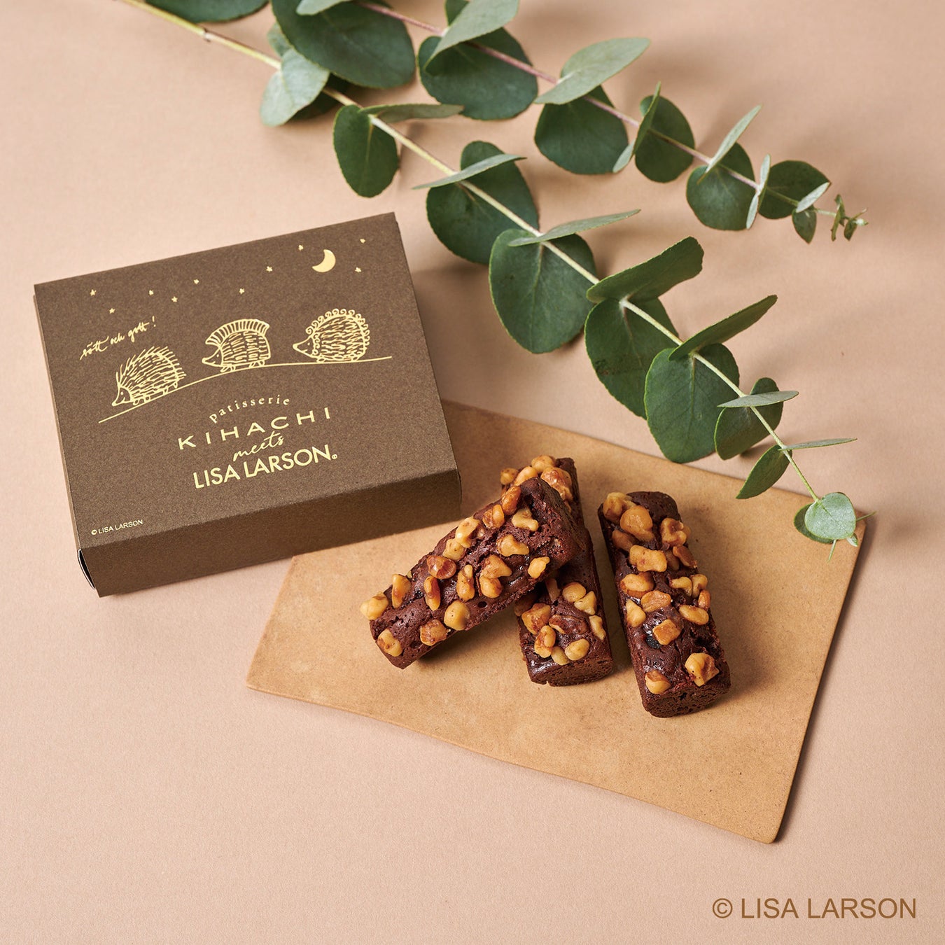 甘酸っぱいクランベリーを入れた濃厚な味わいの焼ショコラ。香ばしいくるみがアクセント。リサ・ラーソンのキャラクターの中でも人気のハリネズミ三兄弟が、北欧の夜空の下、スイーツを探して旅するイメージでデザインしています。