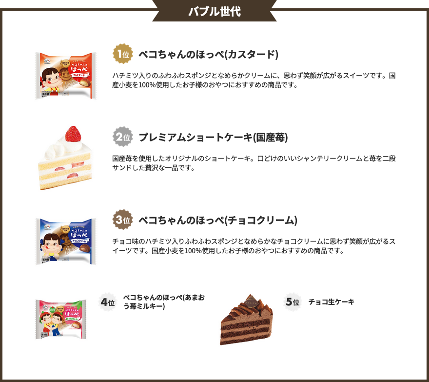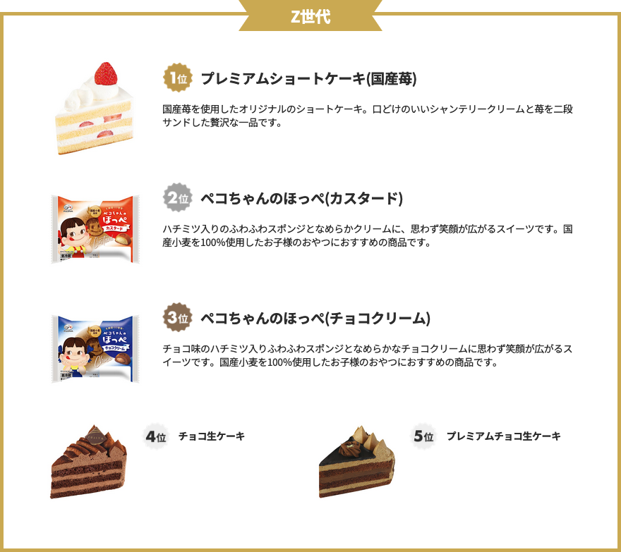 - Z世代は「プレミアムショートケーキ」、バブル世代は「ペコちゃんのほっぺ」が人気! -
